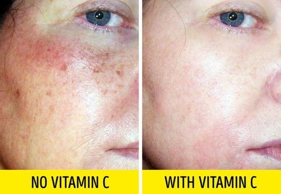 • Vitamin C làm cho da đều màu, ngăn chặn viêm và giúp tổng hợp collagen.