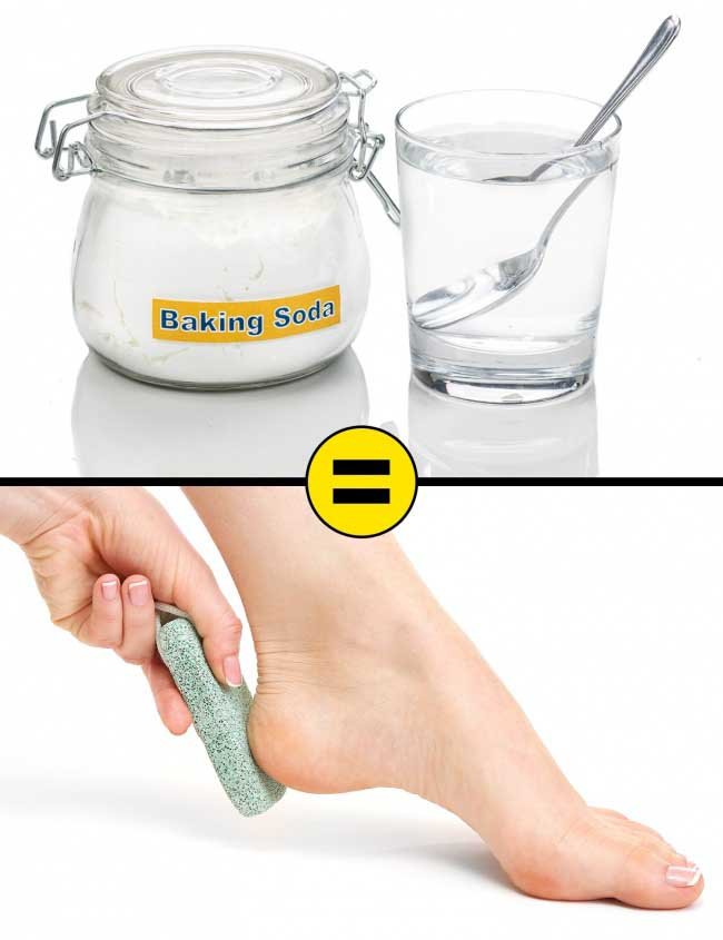 Thêm 3 muỗng canh baking soda vào một bát nước ấm. Trộn đều cho đến khi baking soda tan. Ngâm chân trong hỗn hợp này trong 15 phút. Tiếp đó dùng bọt biển chà nhẹ vào gót chân để tẩy tế bào chết. Rửa sạch chân và lau khô. Áp dụng cách này 2 lần/ tuần.
