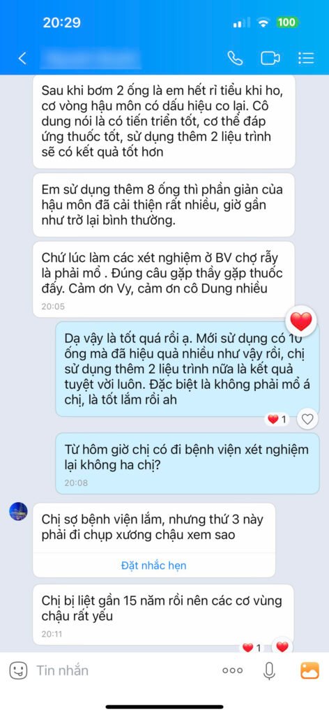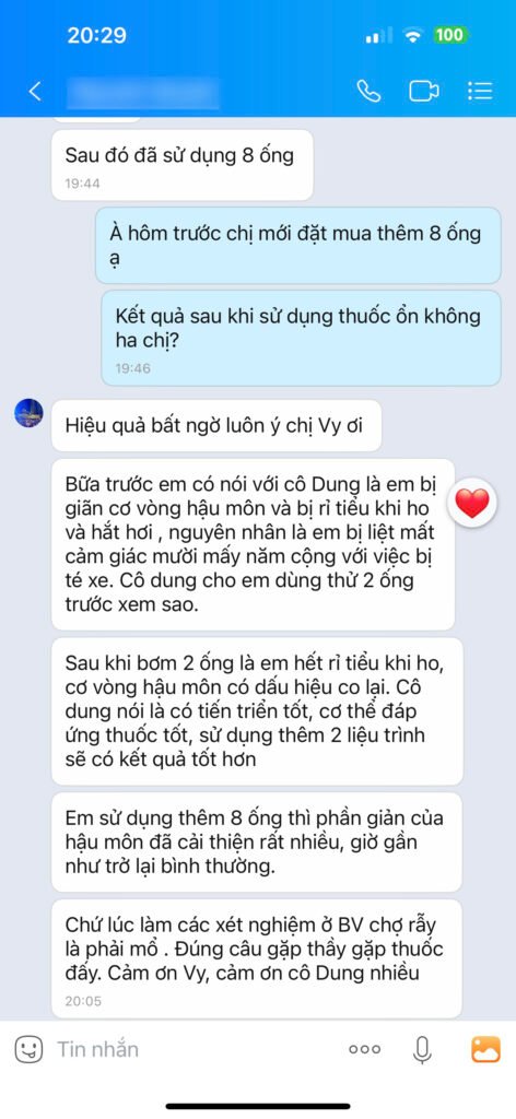 Sau khi sử dụng thêm 8 ống, chị L.Q đã hồi phục rất bất ngờ: “Em sử dụng thêm 8 ống thì phần giãn của hậu môn đã cải thiện rất nhiều, giờ gần như trở lại bình thường”