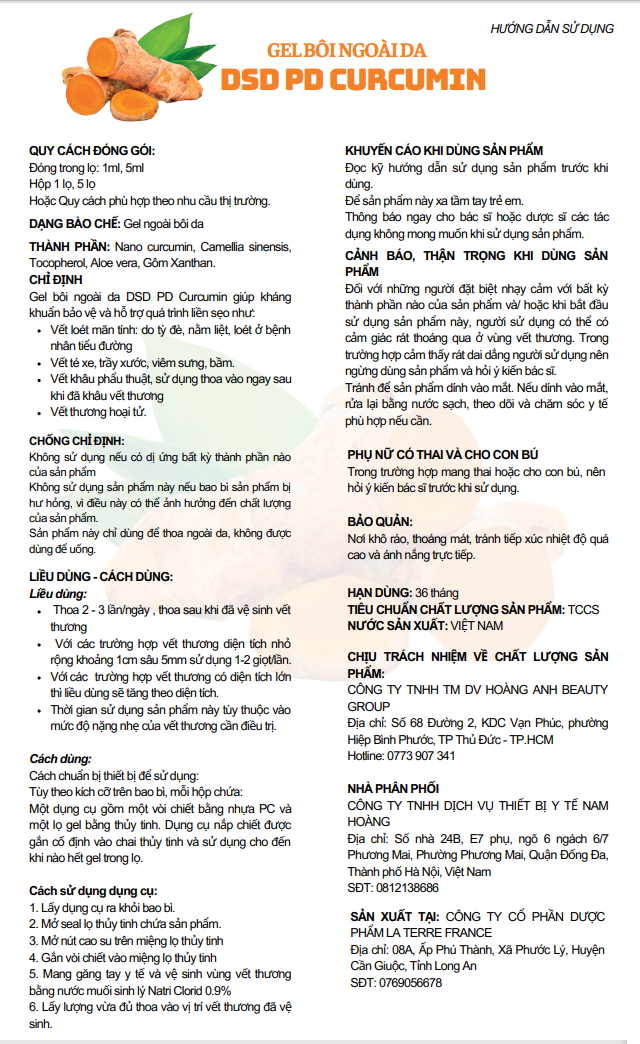 DSD PD Curcumin được điều chế đậm đặc, có hiệu quả ngay khi tiếp xúc với vết thương. Để đạt được hiệu quả cao nhất, nên sử dụng 2 – 3 lần/ngày, thoa sau khi đã vệ sinh vết thương.